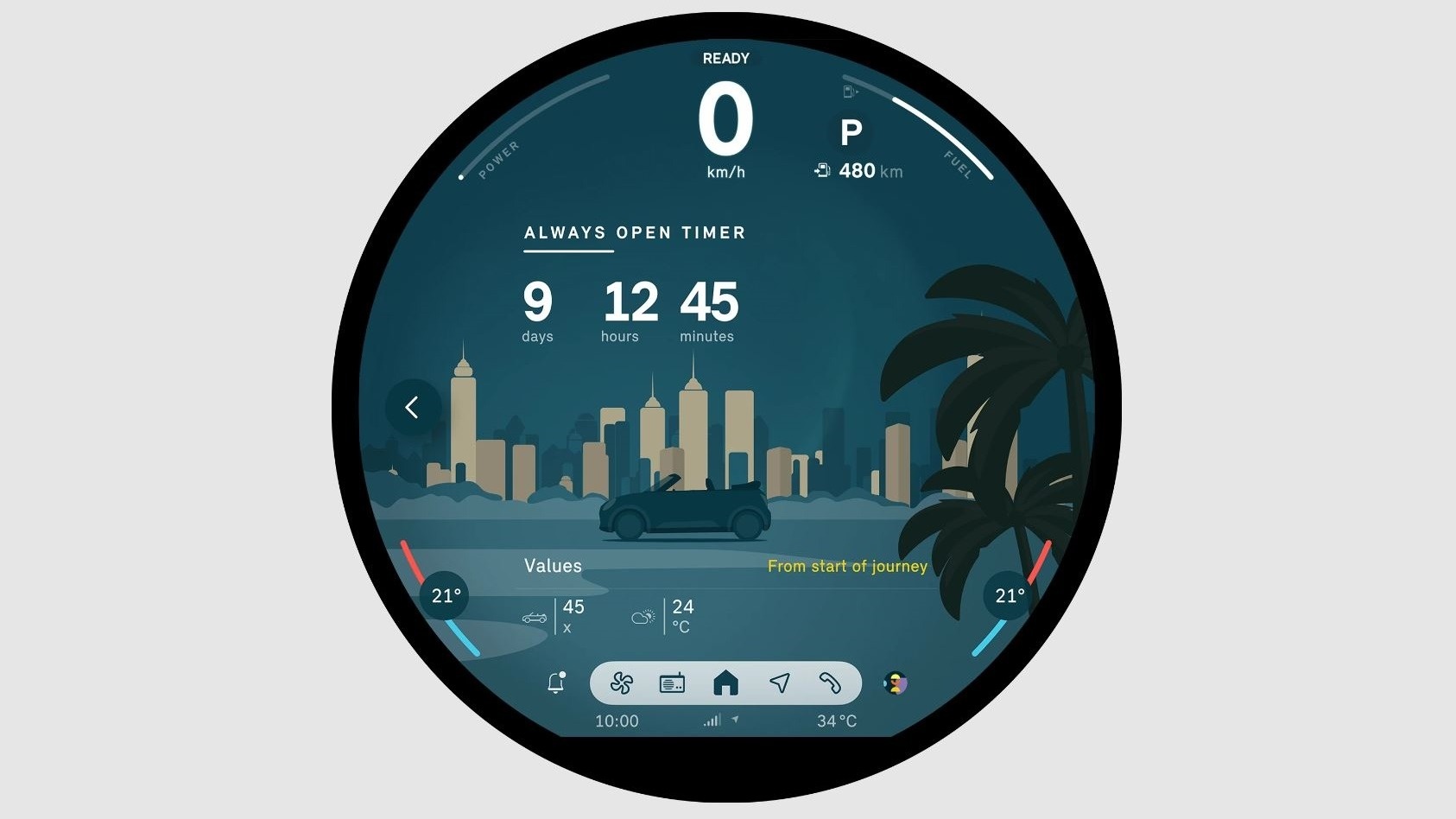 Узнайте, сколько точно времени Вы провели за рулем автомобиля с открытым верхом. Опустите крышу, и по сигналу запустится таймер Always Open. Этот счетчик показывает время движения с открытым верхом в течение одной поездки и общее время. Кроме того, он информирует Вас о температуре наружного воздуха с помощью соответствующих анимированных графиков, показывая, насколько на улице прохладно или жарко.