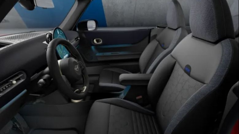 - Сиденья JCW с обивкой из синтетической кожи Vescin бежевого или синего цвета Nightshade Blue с окантовкой и цветным швом